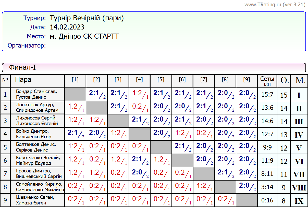 Результати “Вечірнього турніру” за 14.02.2023