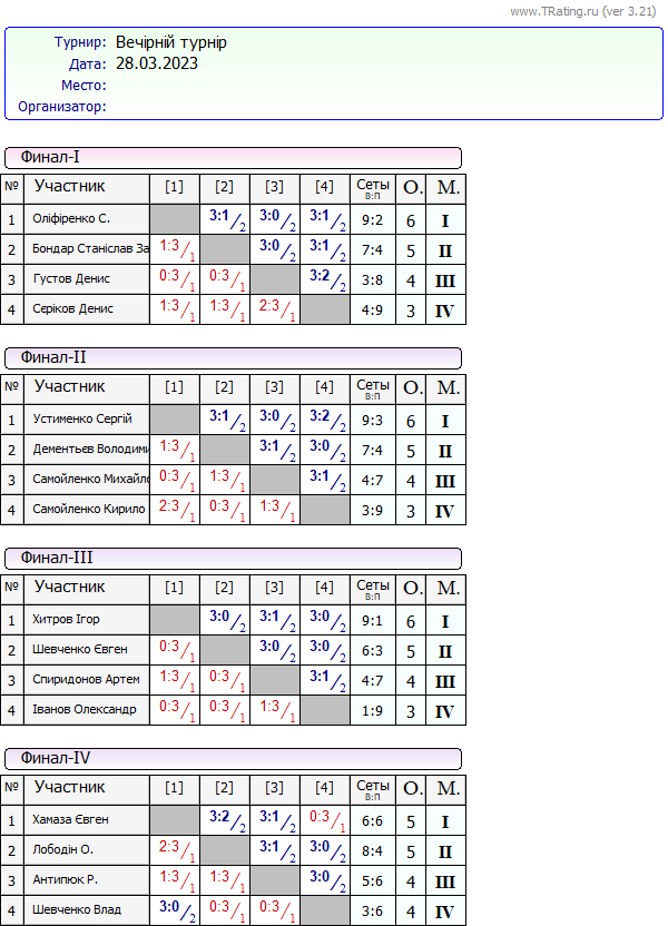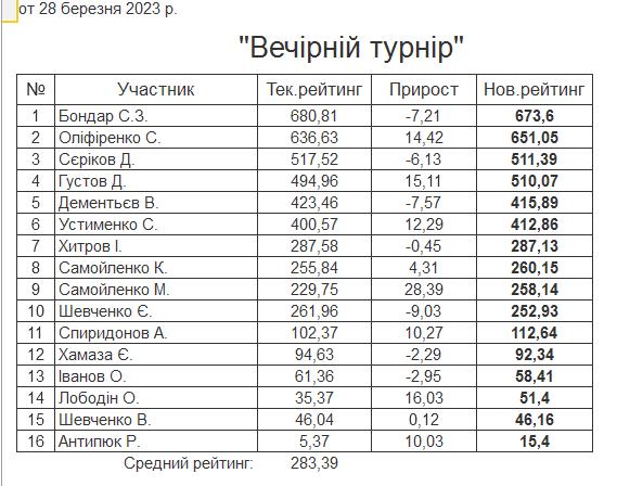 Результати “Вечірнього турніру” за 28.03.2023