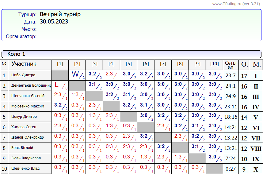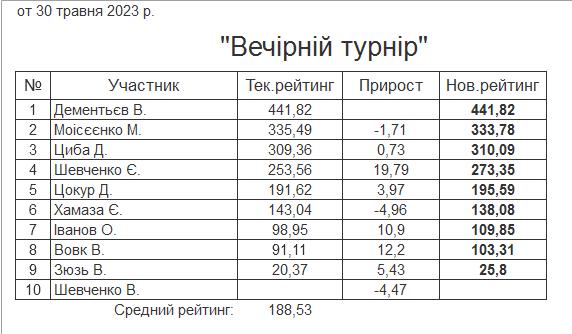 Результати “Вечірнього турніру” за 30.05.2023