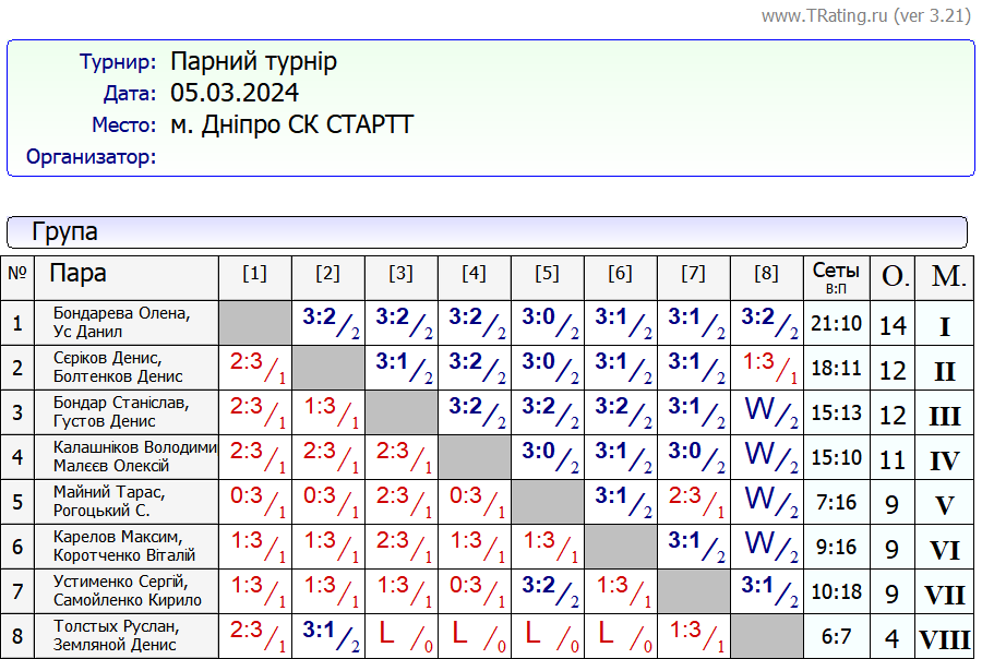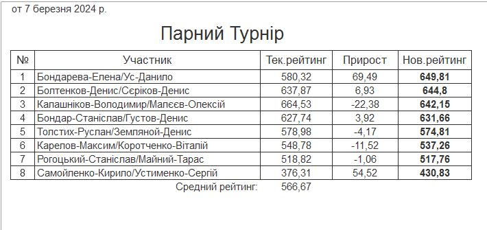 Результати Парного Турніру за 05.03.2024