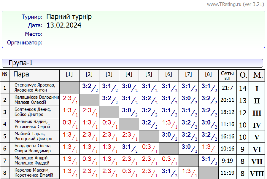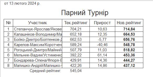 Результати “Парного турніру” за 13.02.2024
