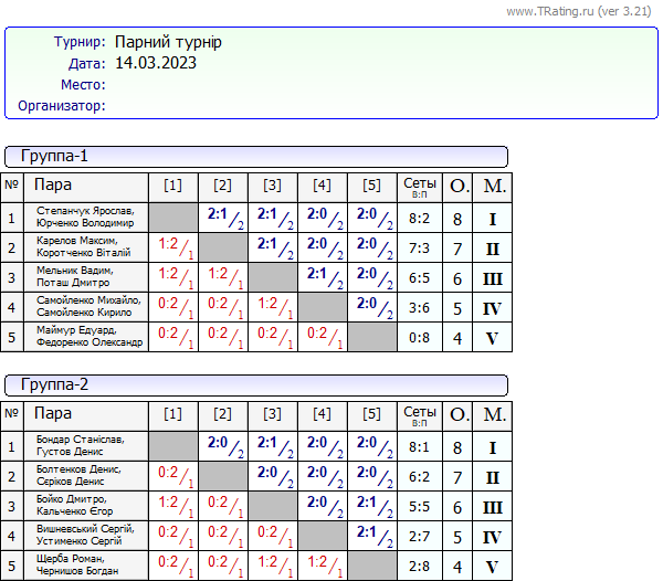 Результати “Парного турніру” за 14.03.2023
