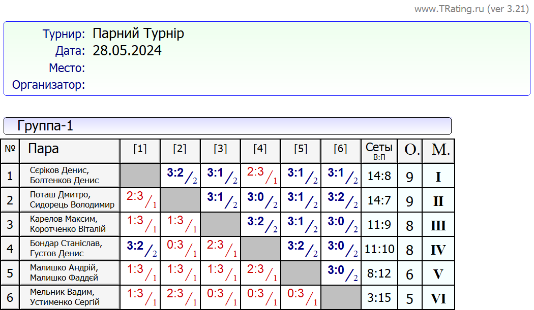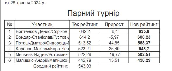 Результати Парного Турніру за 28.05.2024