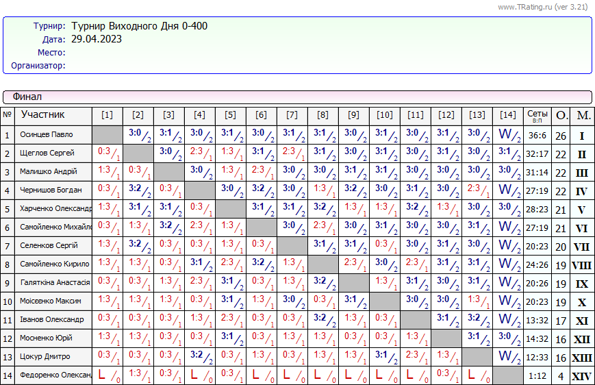 Результати турніру “Вихідного дня 0-400” за 29.04.2023