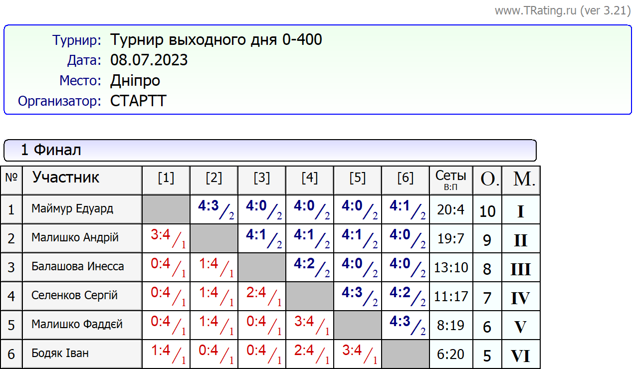Результати турніру “Вихідного дня 0-400” за 08.07.2023