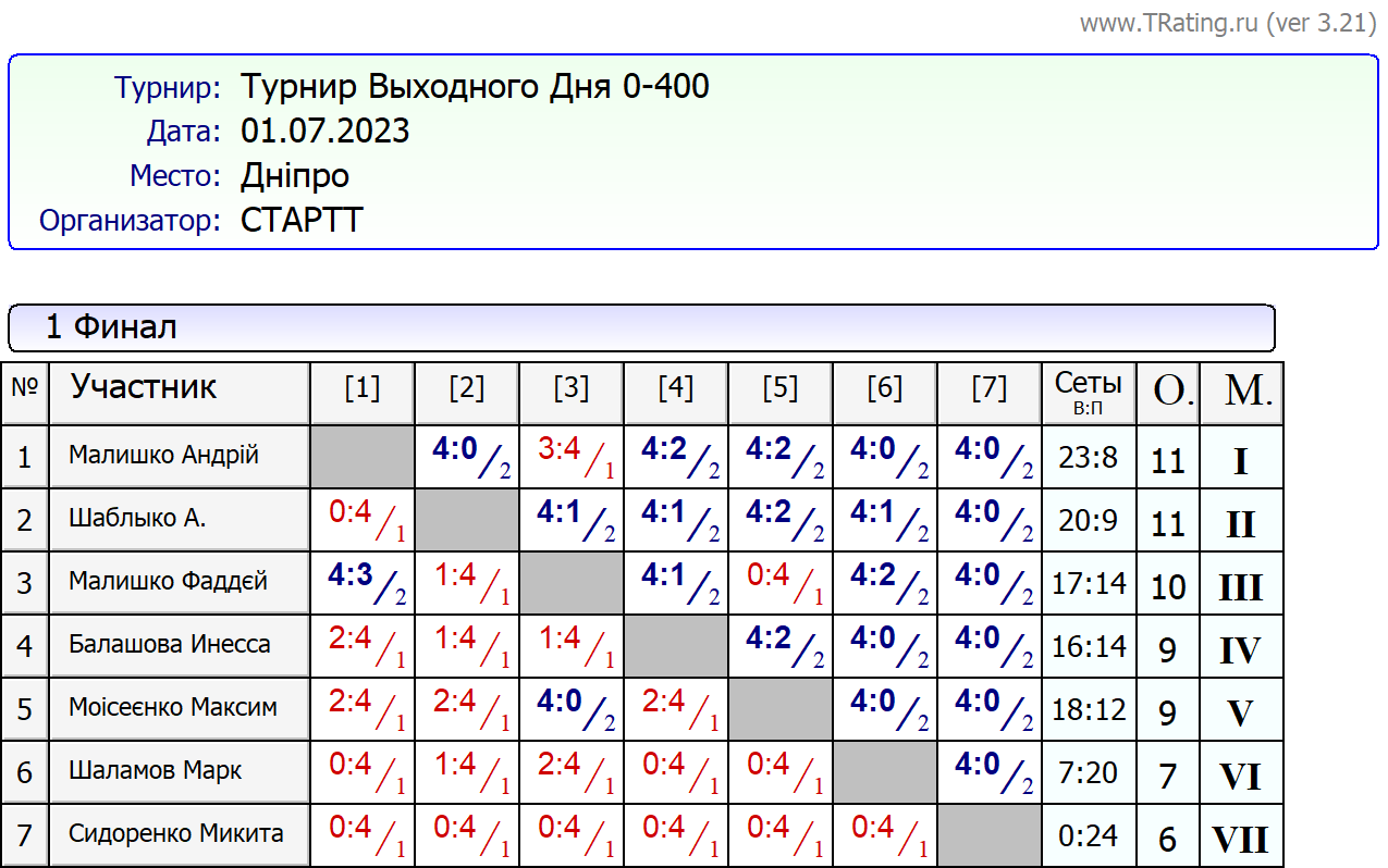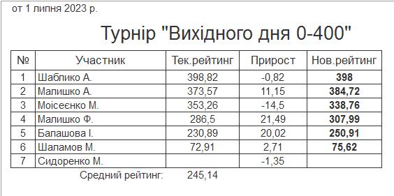Результати турніру “Вихідного дня 0-400” за 01.07.2023