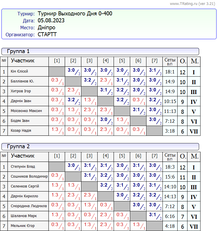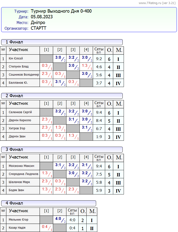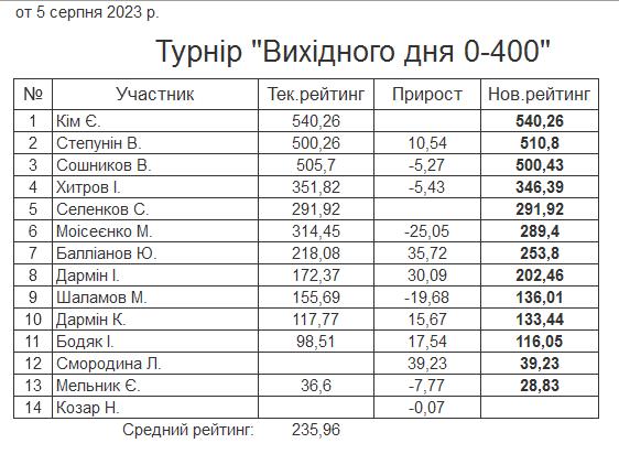 Результати турніру “Вихідного дня 0-400” за 05.08.2023