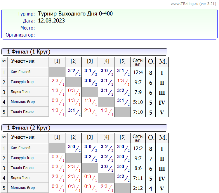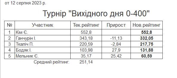 Результати турніру “Вихідного дня 0-400” за 12.08.2023