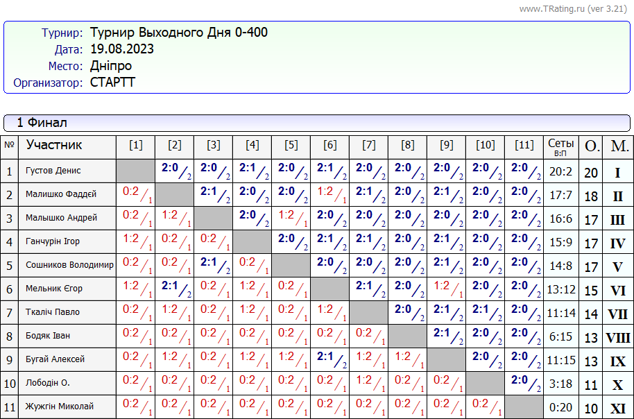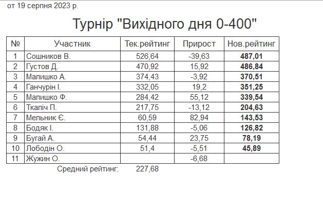 Результати турніру “Вихідного дня 0-400” за 19.08.2023