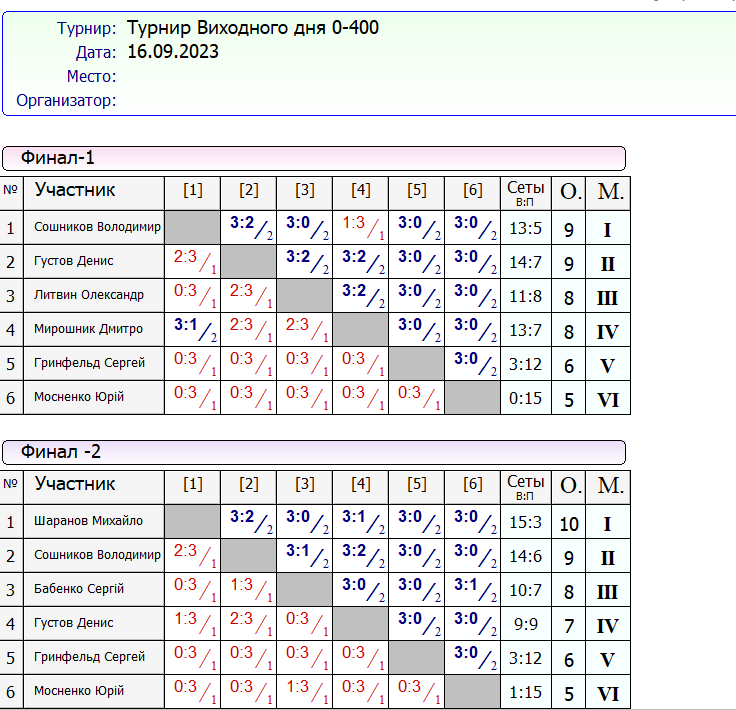 Результати турніру “Вихідного дня 0-400” за 16.09.2023