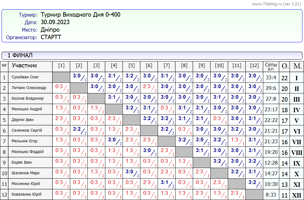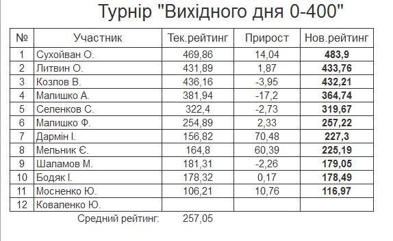 Результати турніру “Вихідного дня 0-400” за 30.09.2023