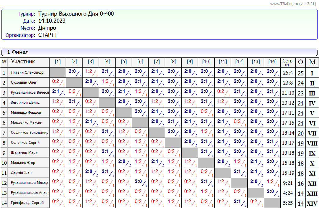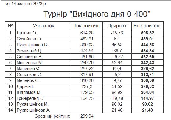 Результати турніру “Вихідного дня 0-400” за 14.10.2023