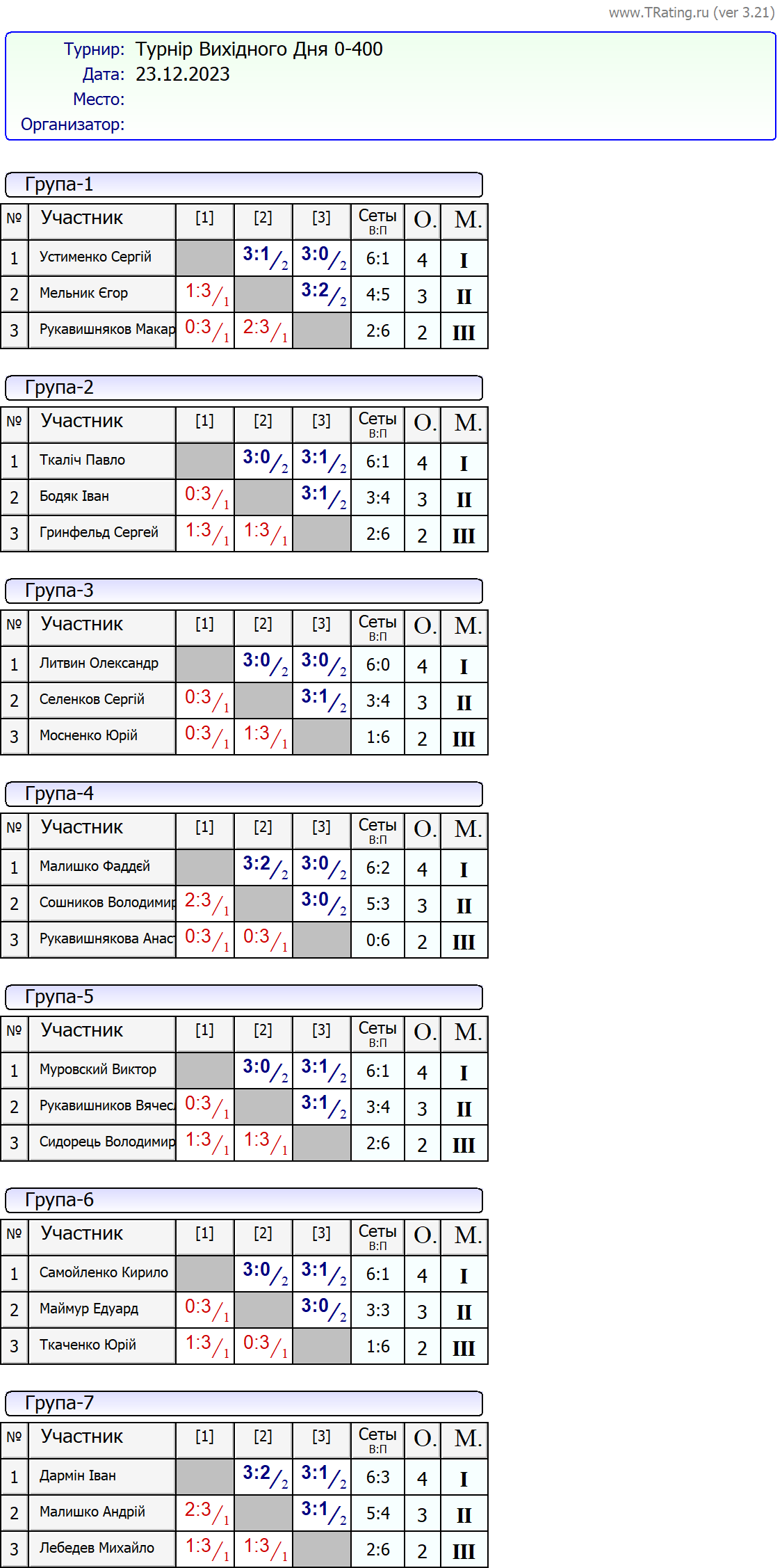 Результати турніру “Вихідного дня 0-400” за 23.12.2023
