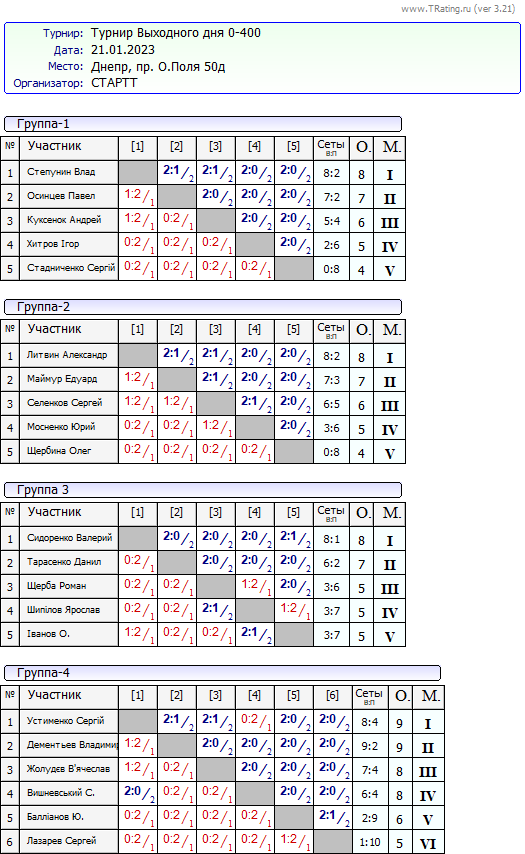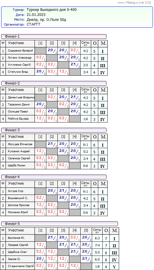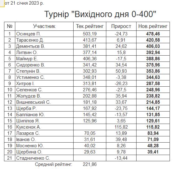 Результати турніру “Вихідного дня 0-400” за 21.01.2023