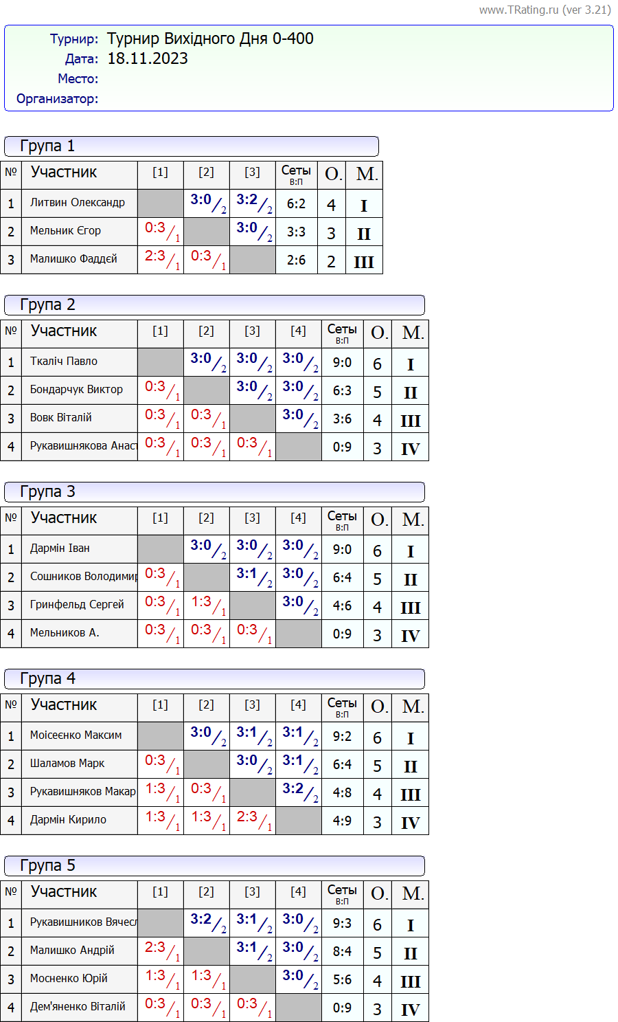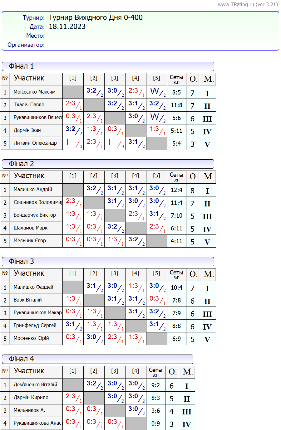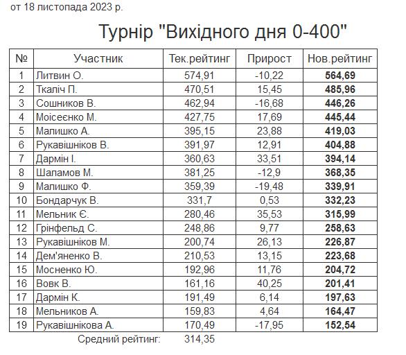 Результати турніру “Вихідного дня 0-400” за 18.11.2023