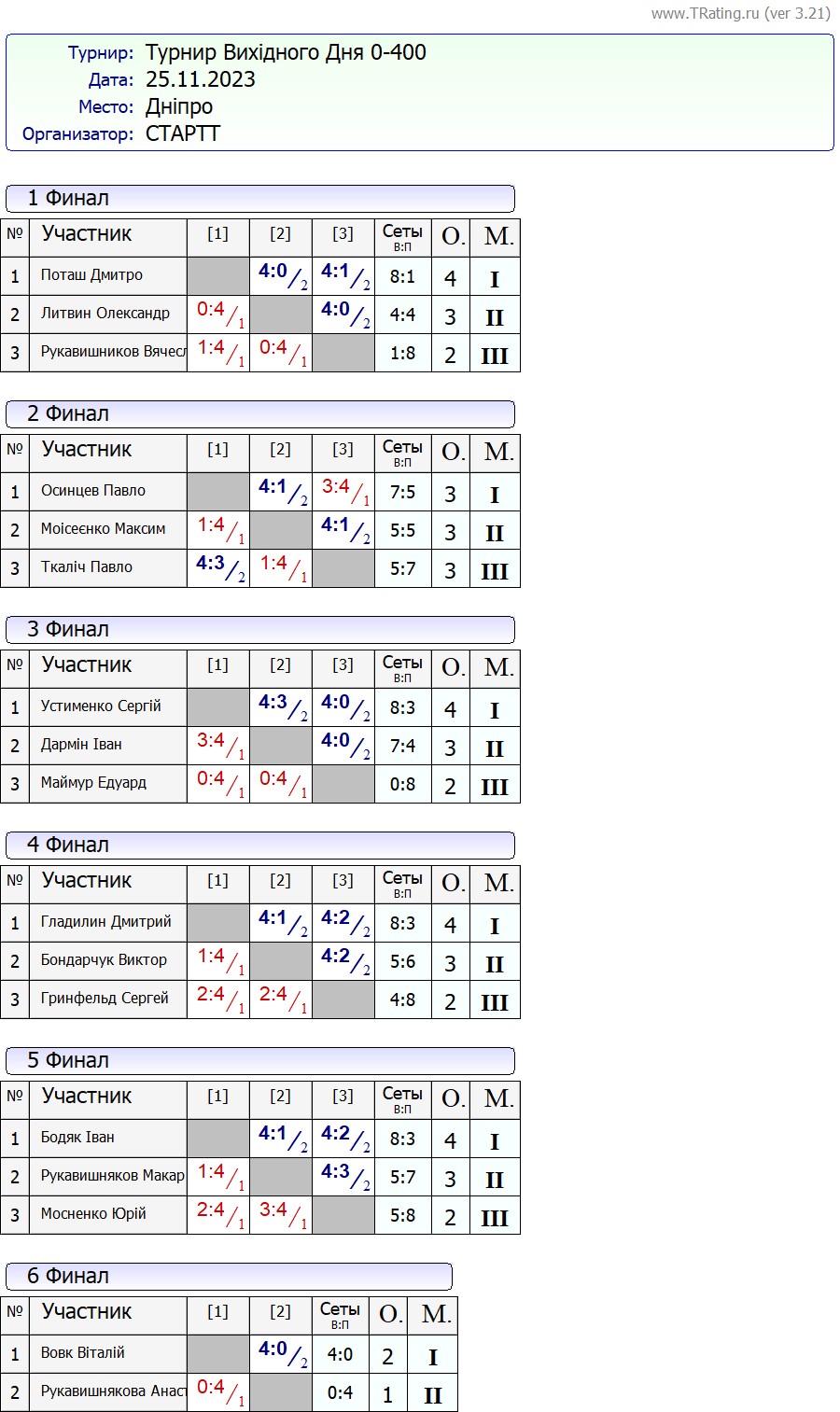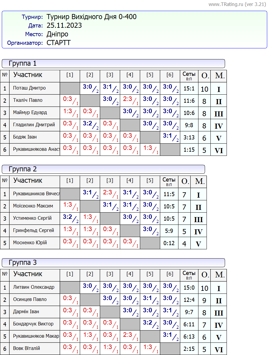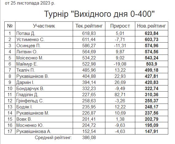 Результати турніру “Вихідного дня 0-400” за 25.11.2023