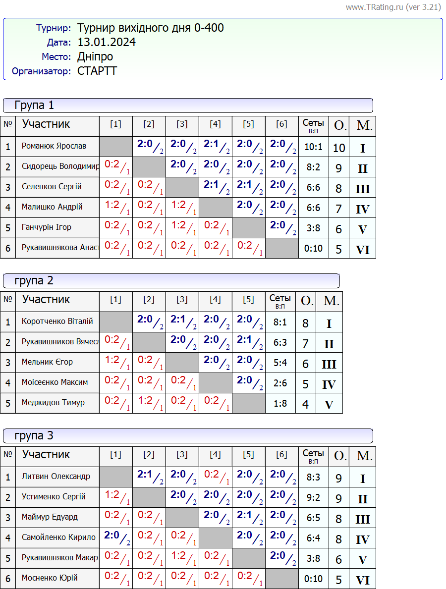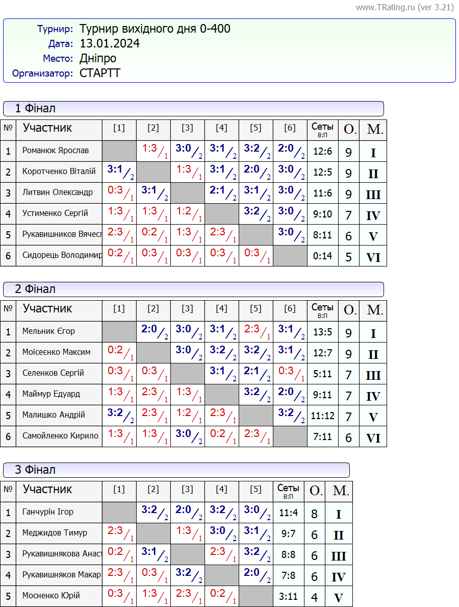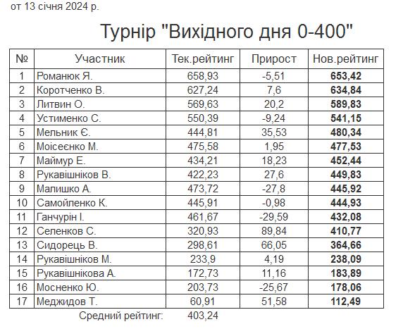 Результати турніру “Вихідного дня 0-400” за 13.01.2024