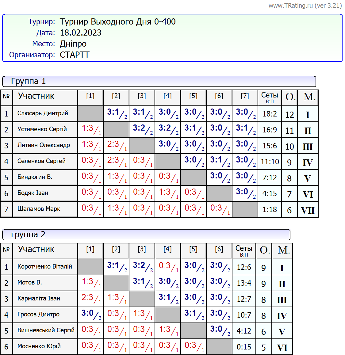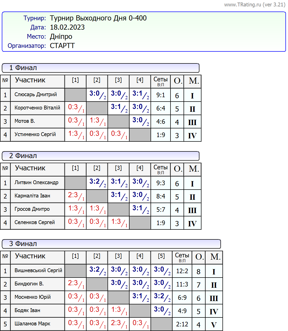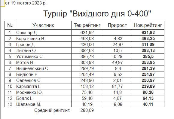 Результати турніру “Вихідного дня 0-400” за 18.02.2023