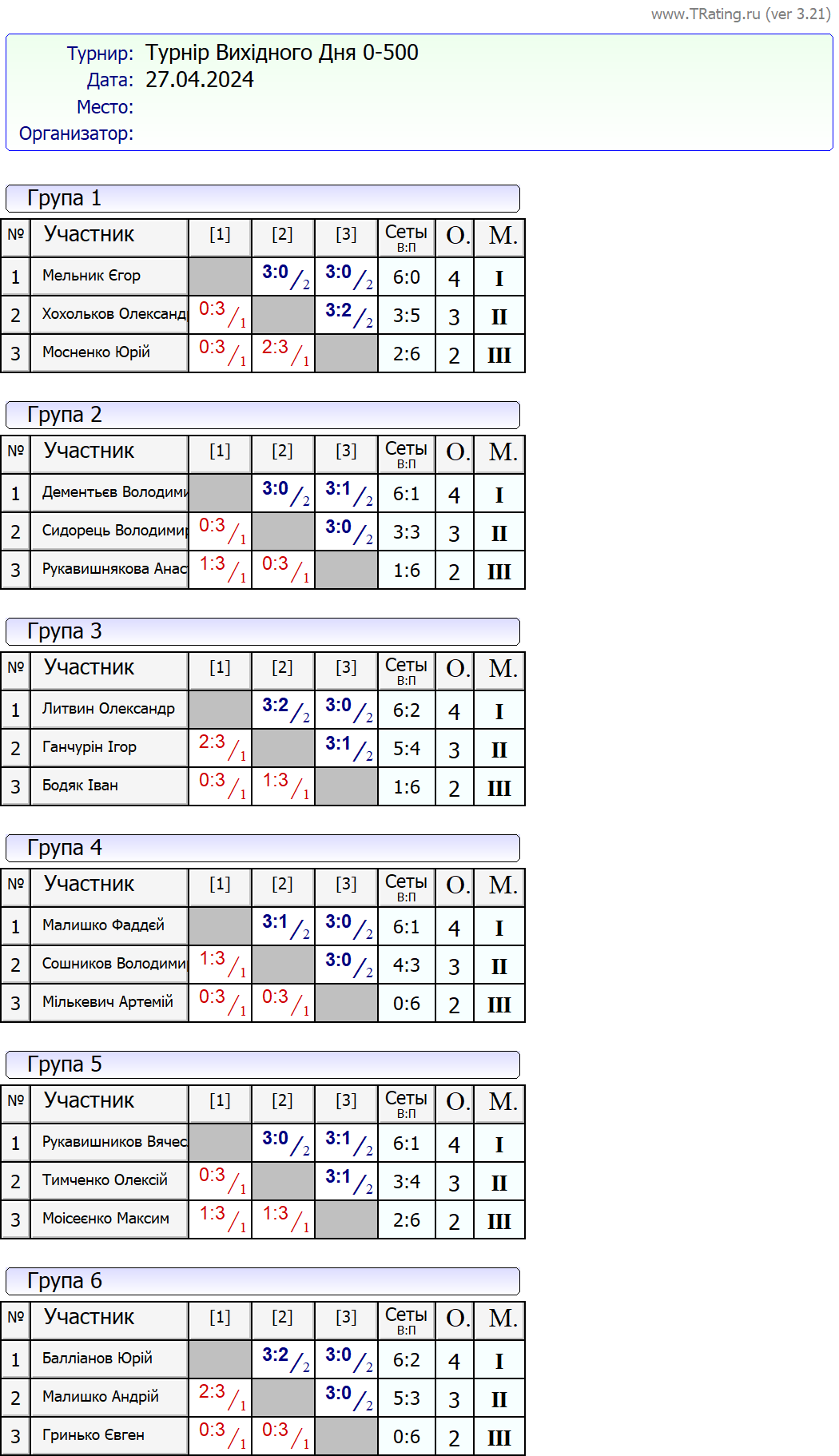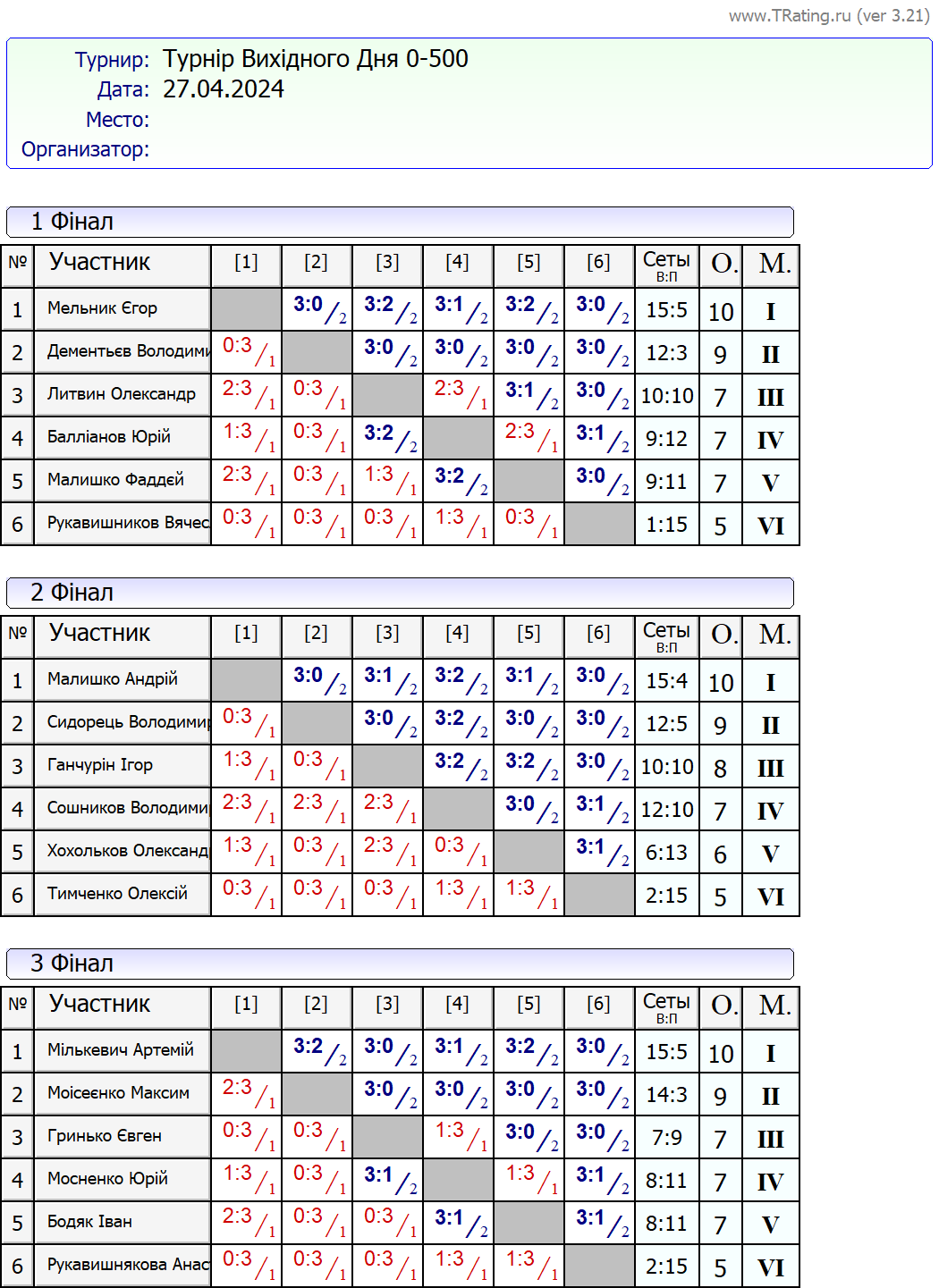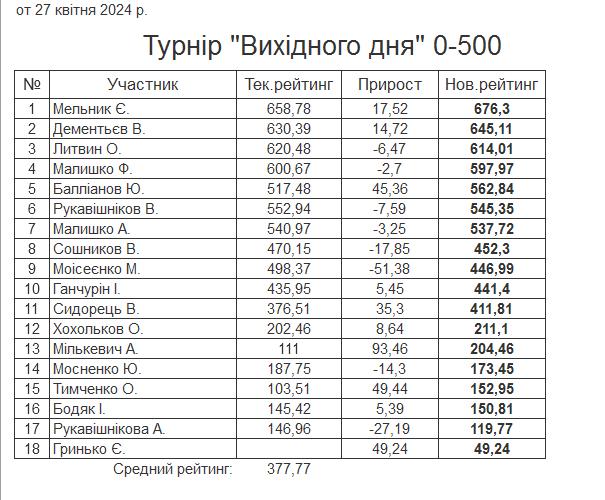 Результати турніру “Вихідного дня 0-500” за 27.04.2024