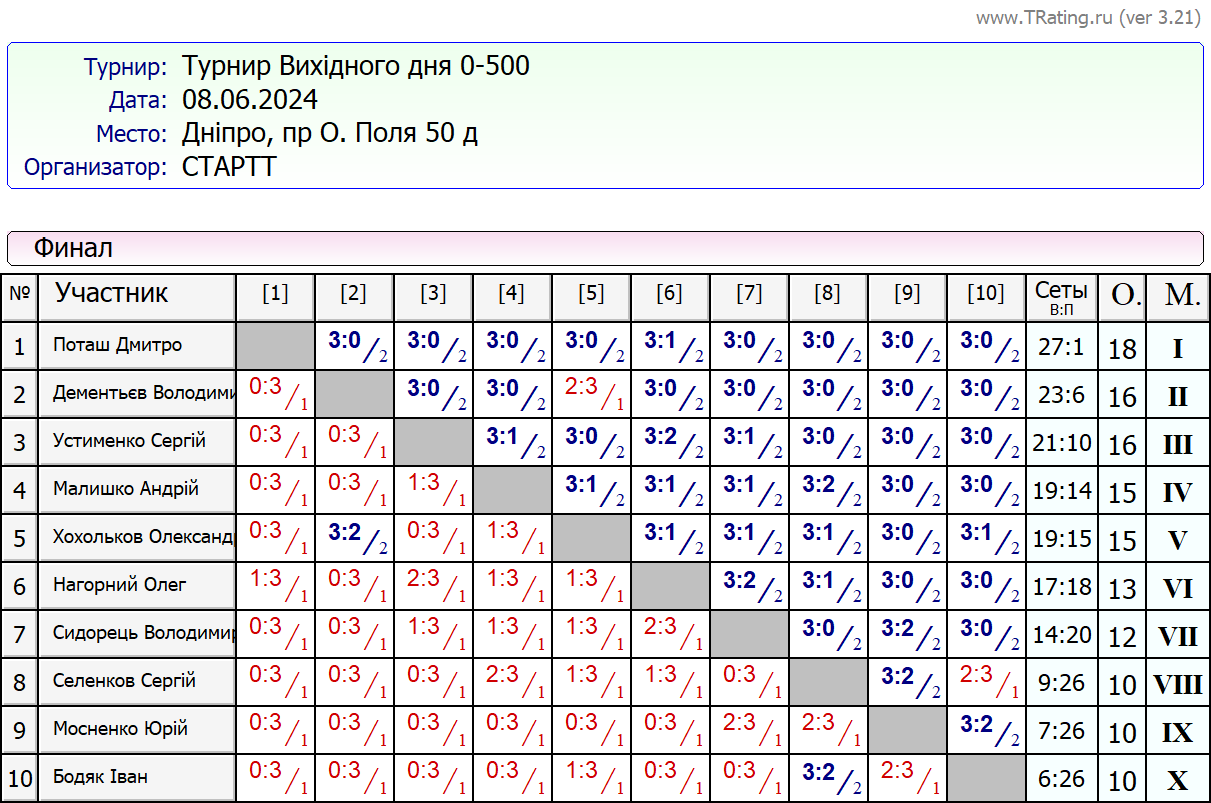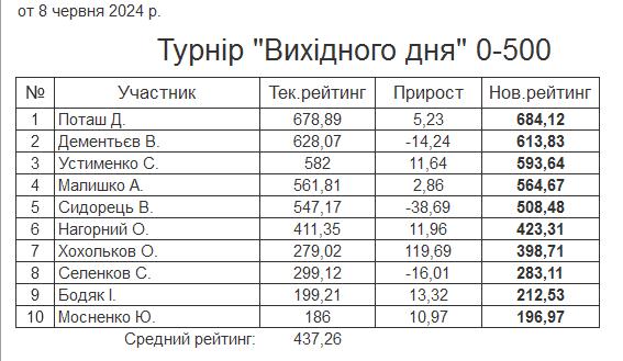 Результати турніру “Вихідного дня 0-500” за 8.06.2024