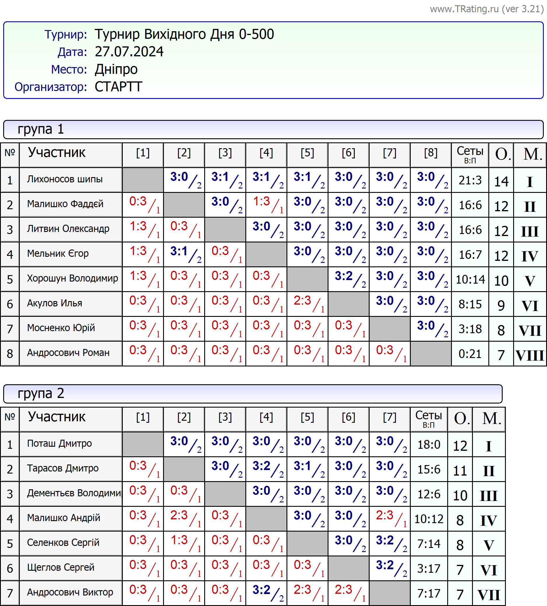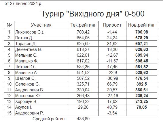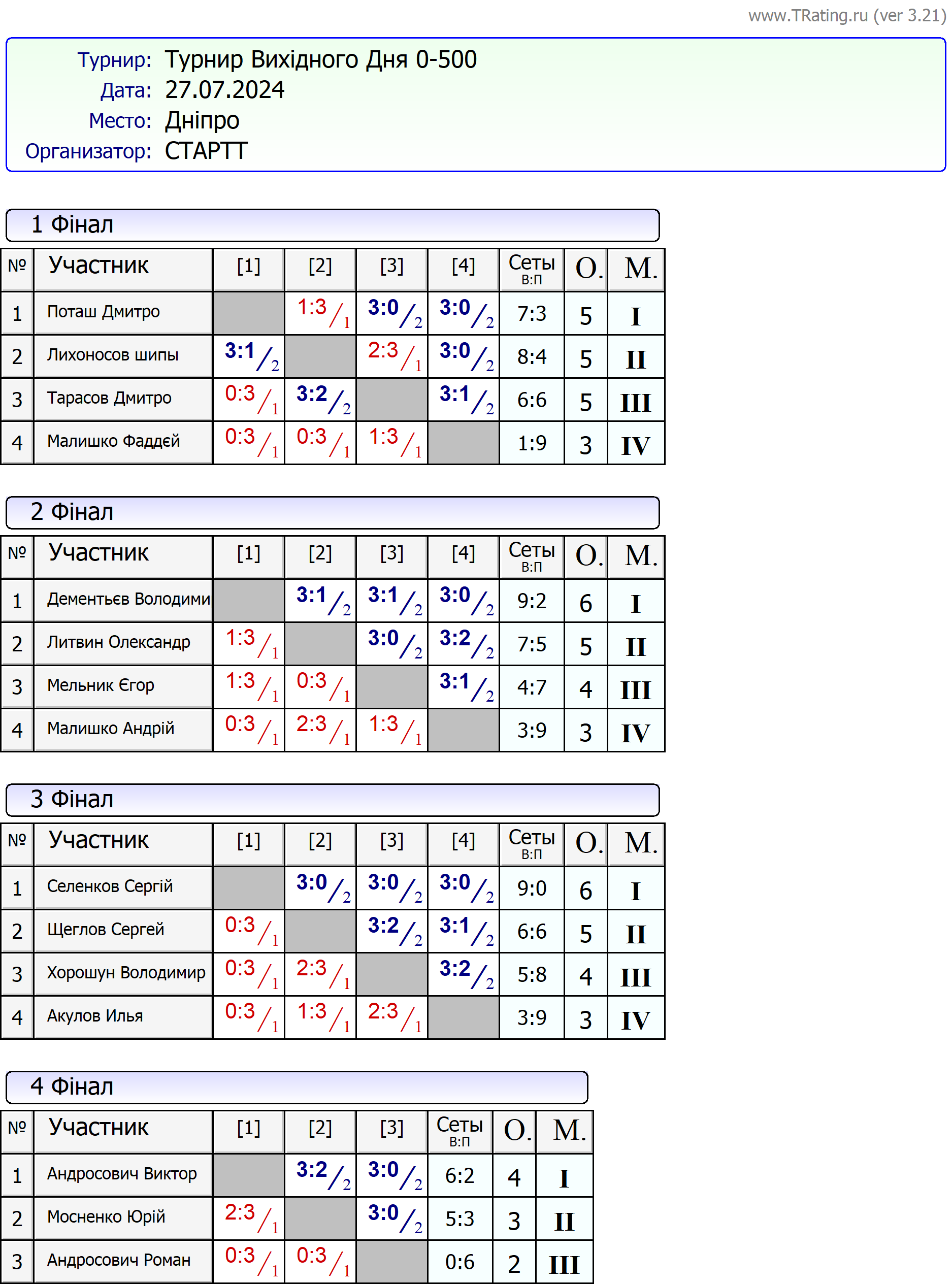 Результати турніру “Вихідного дня 0-500” за 27.07.2024