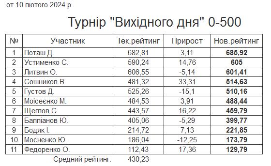 Результати турніру “Вихідного дня 0-500” за 10.02.2024