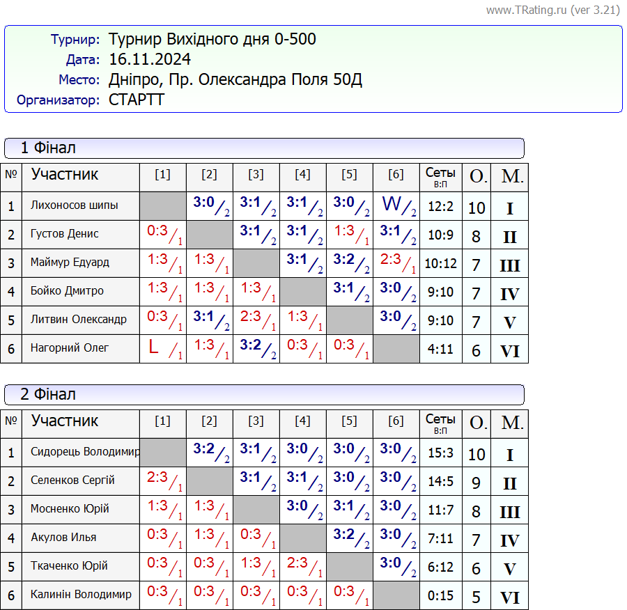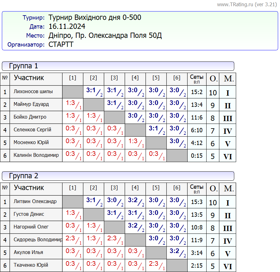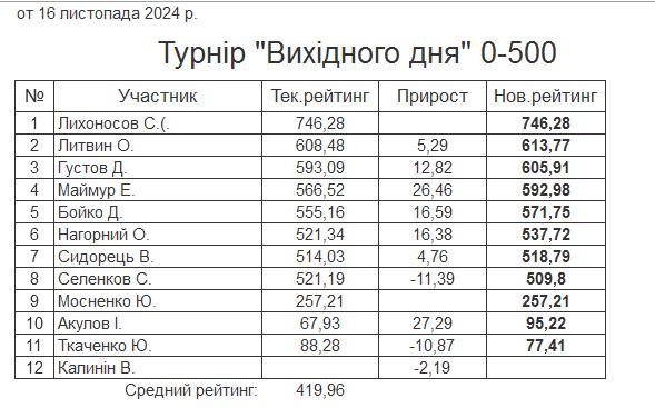 Результати турніру “Вихідного дня 0-500” за 16.11.2024