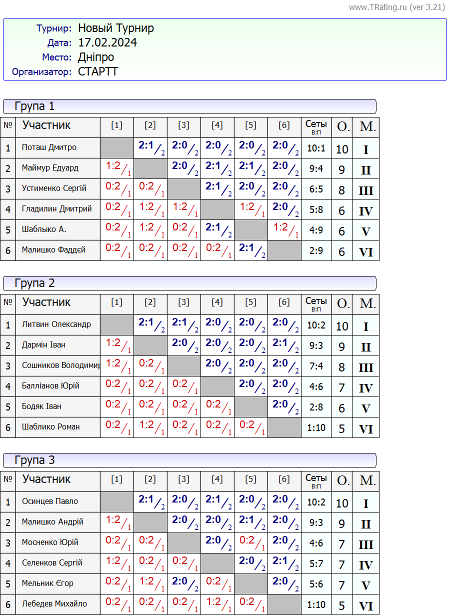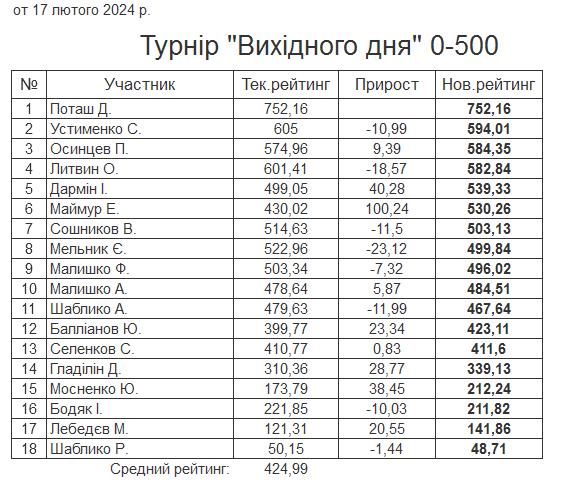 Результати турніру “Вихідного дня 0-500” за 17.02.2024