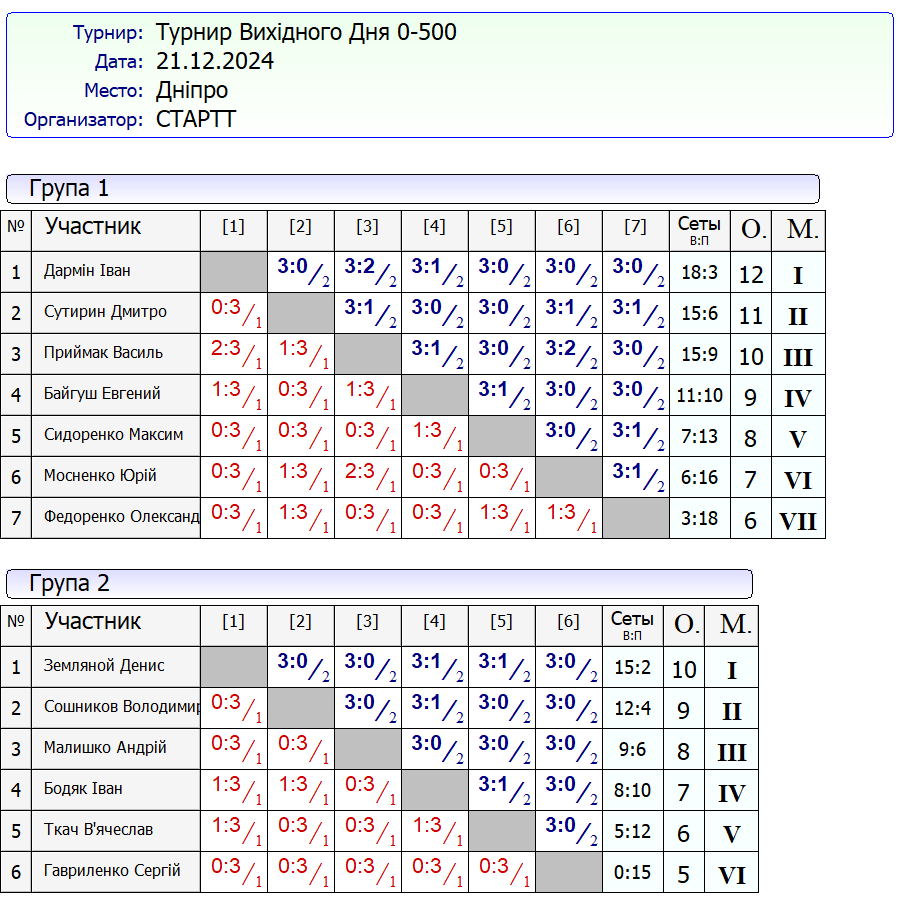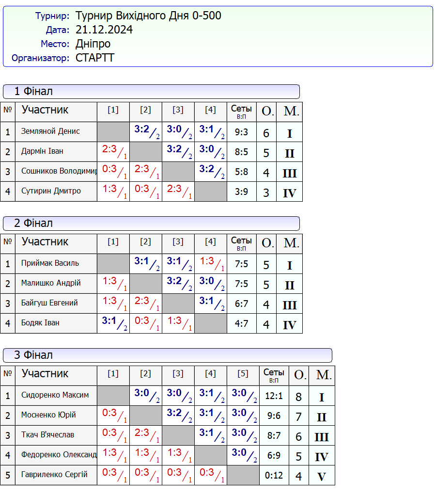 Результати турніру “Вихідного дня 0-500” за 21.12.2024