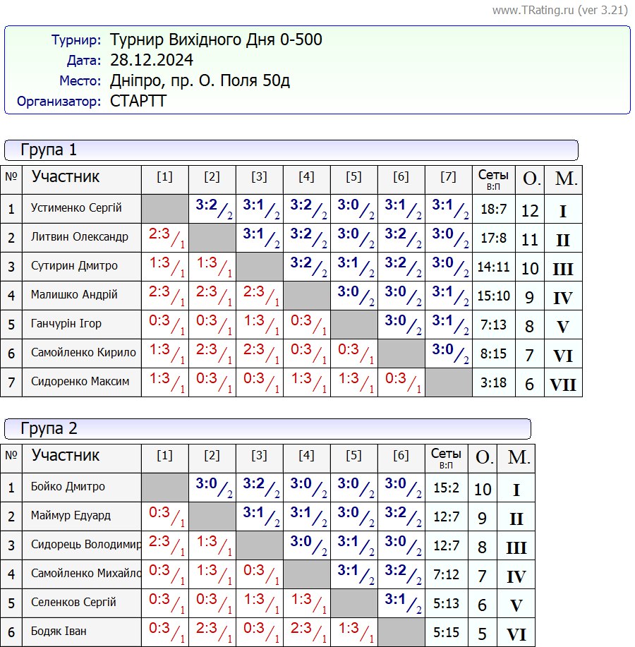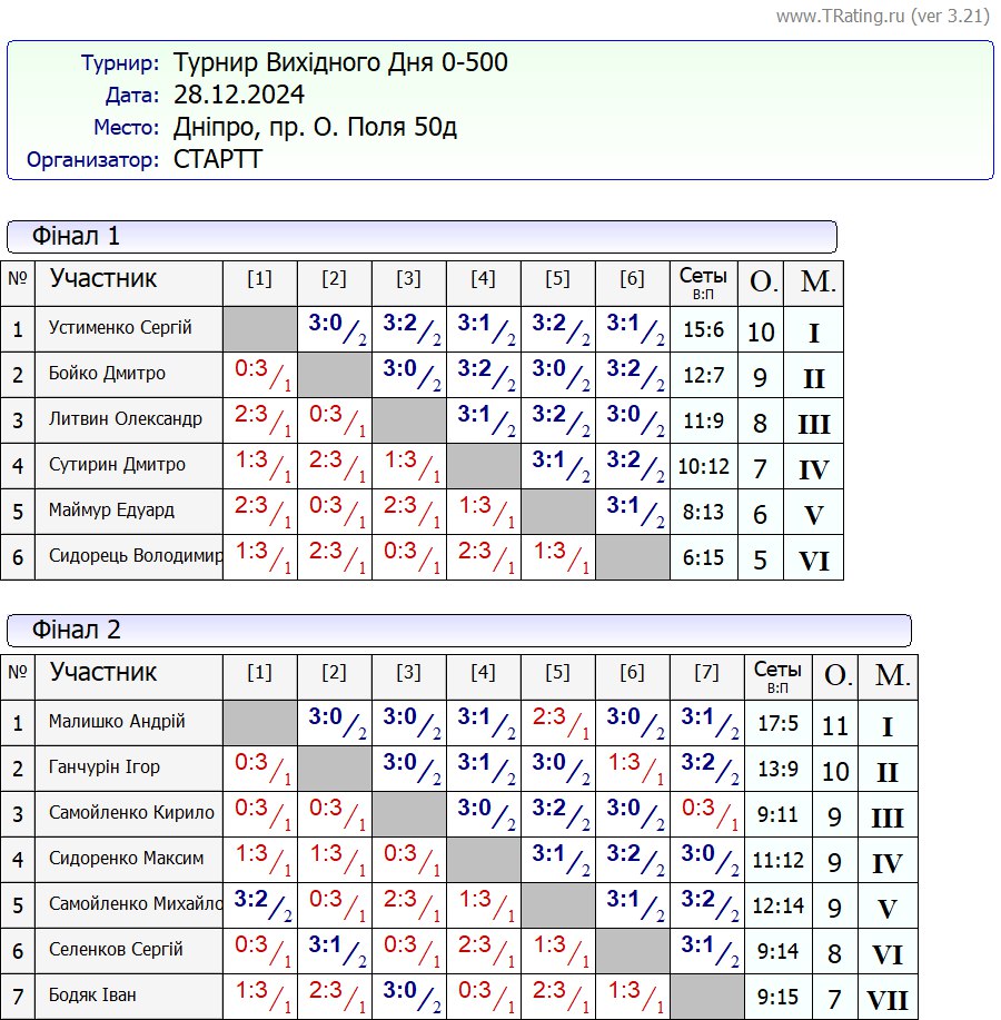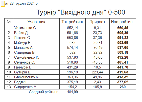 Результати турніру “Вихідного дня 0-500” за 28.12.2024
