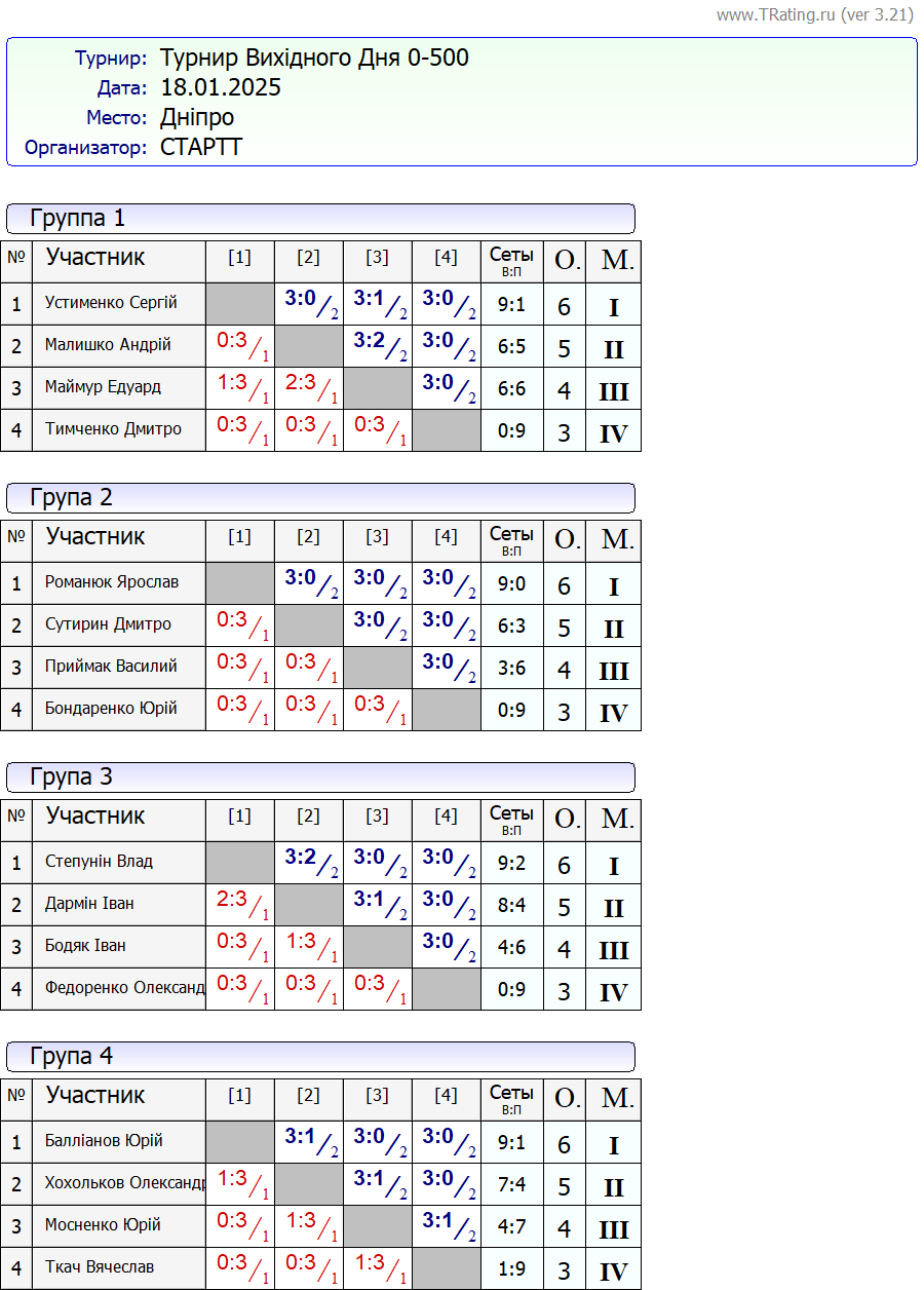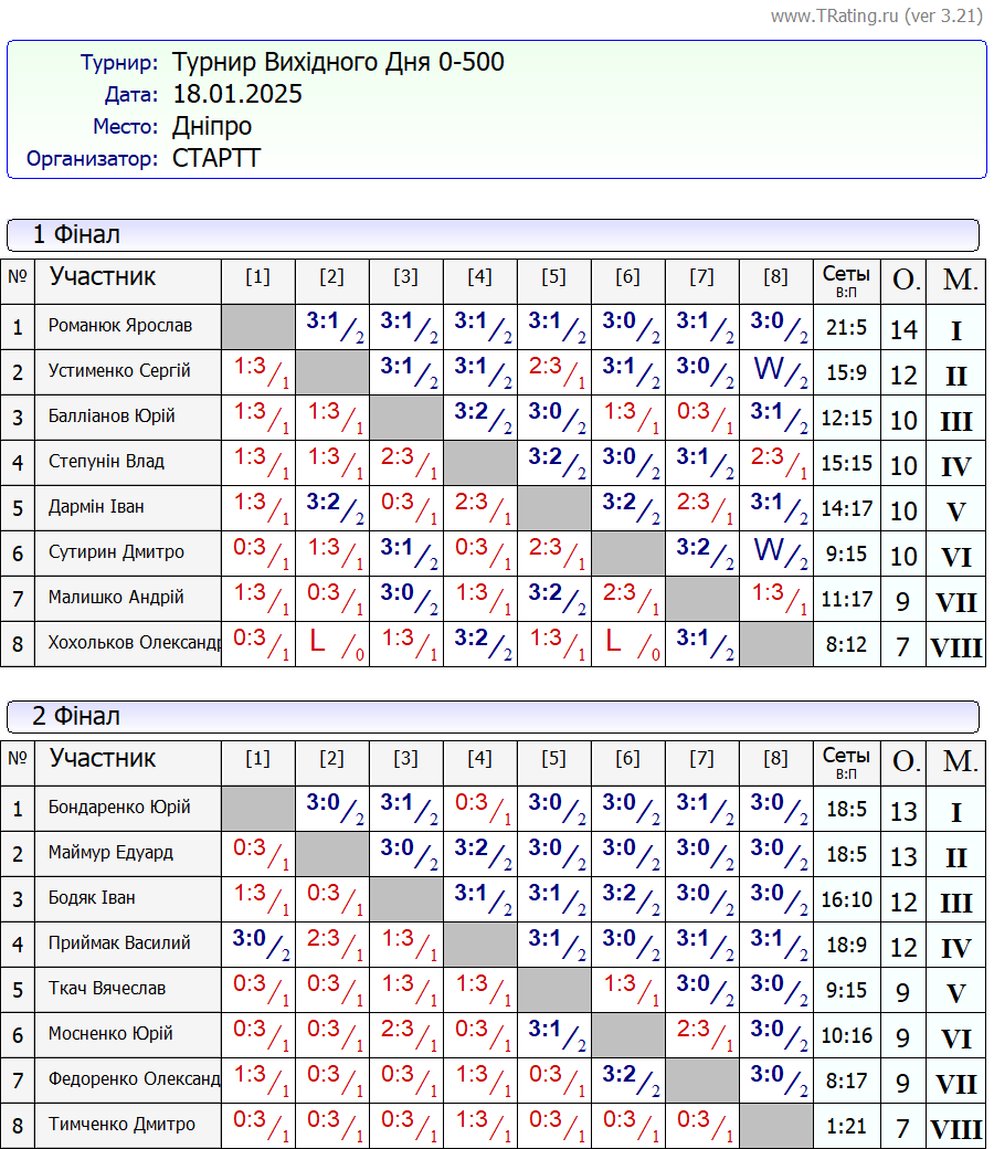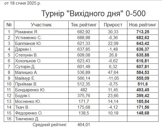 Результати турніру “Вихідного дня 0-500” за 18.01.2025