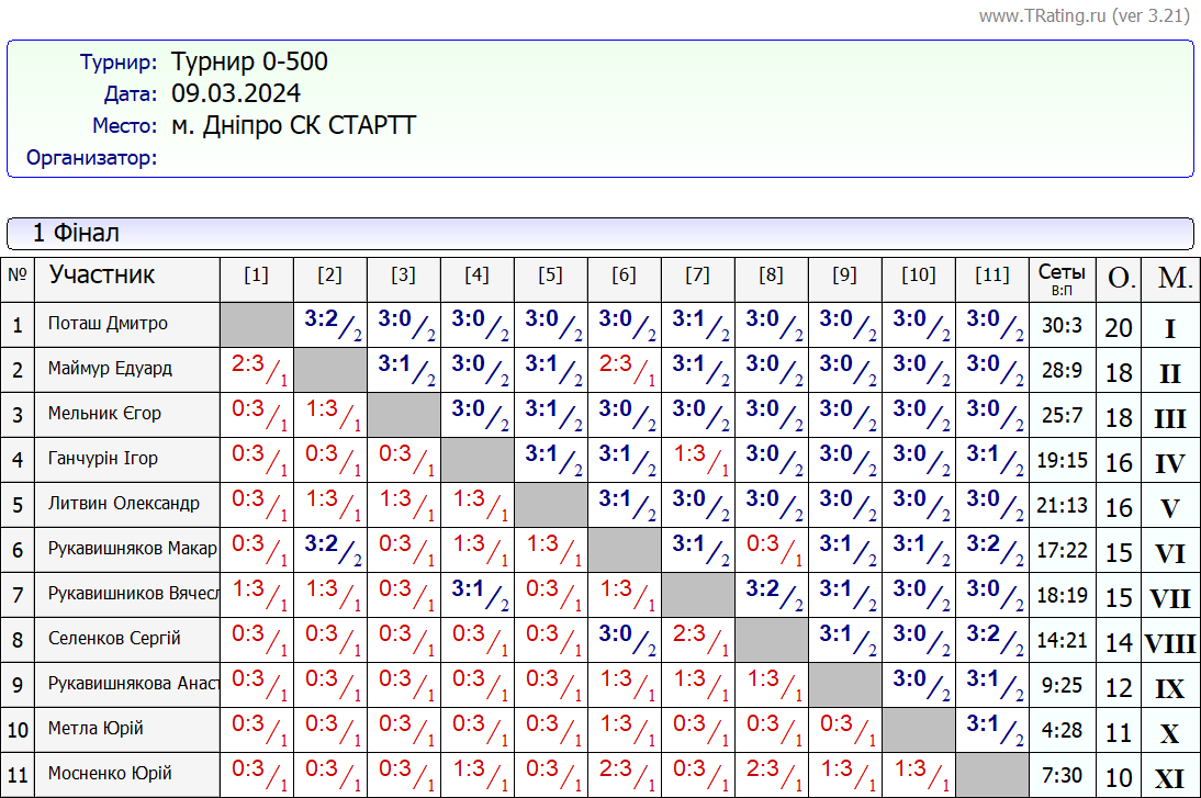 Результати турніру “Вихідного дня 0-500” за 09.03.2024