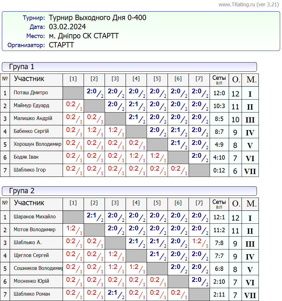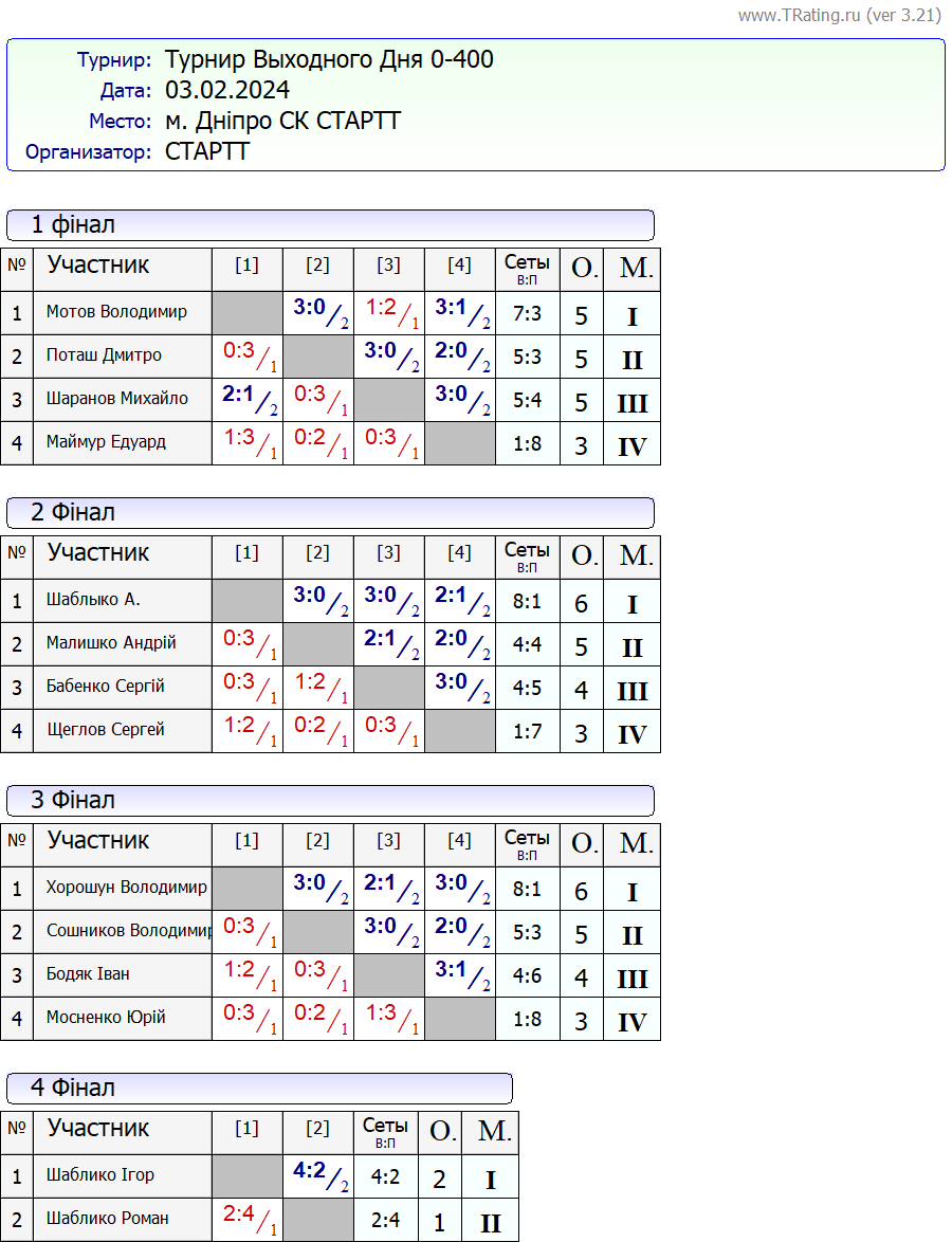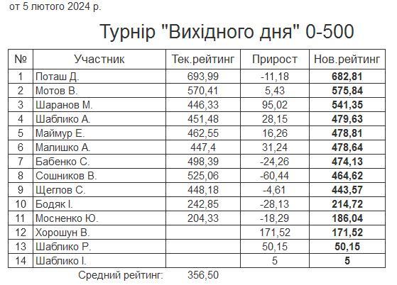 Результати турніру “Вихідного дня 0-500” за 03.02.2024