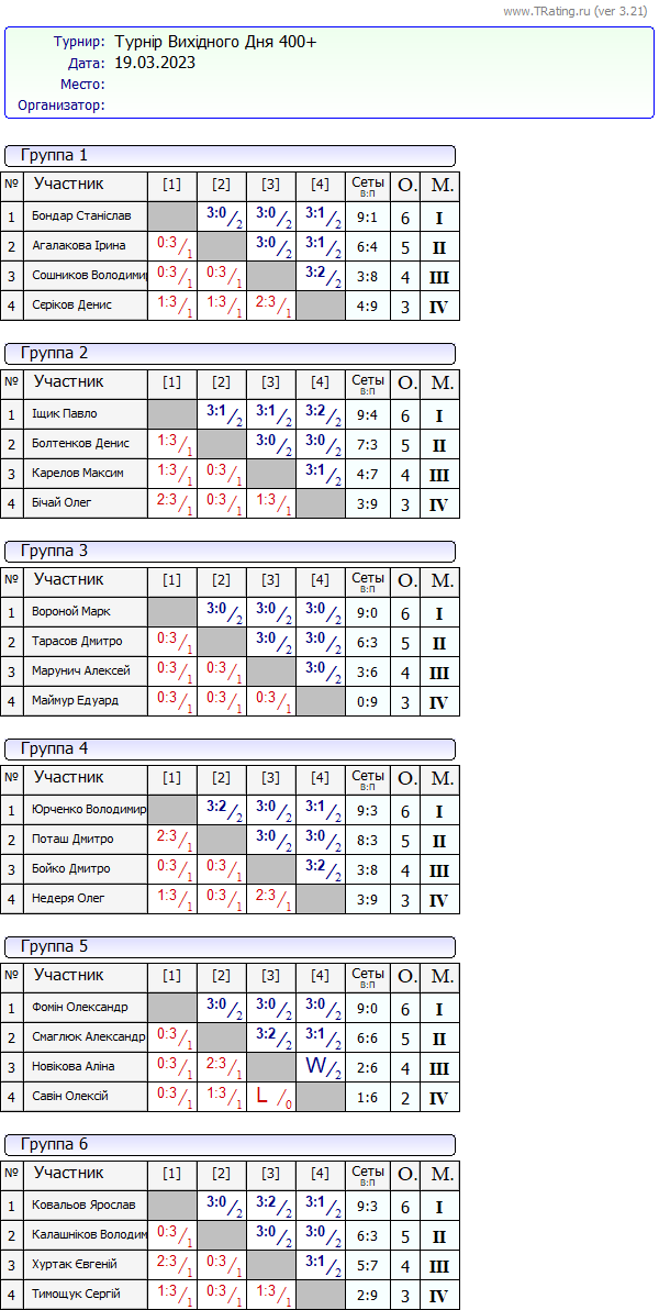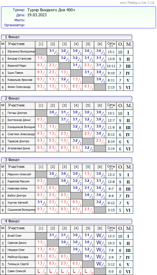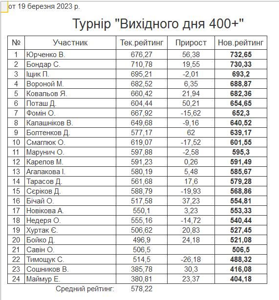 Результати турніру “Вихідного дня 400+” за 19.03.2023