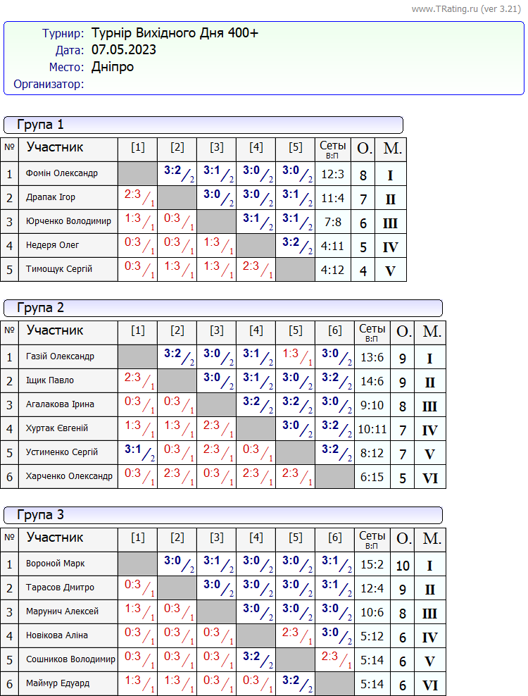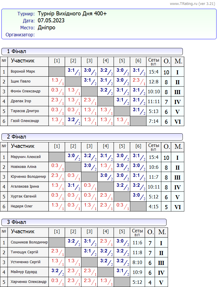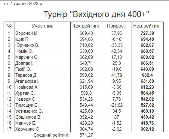 Результати турніру “Вихідного дня 400+” за 07.05.2023