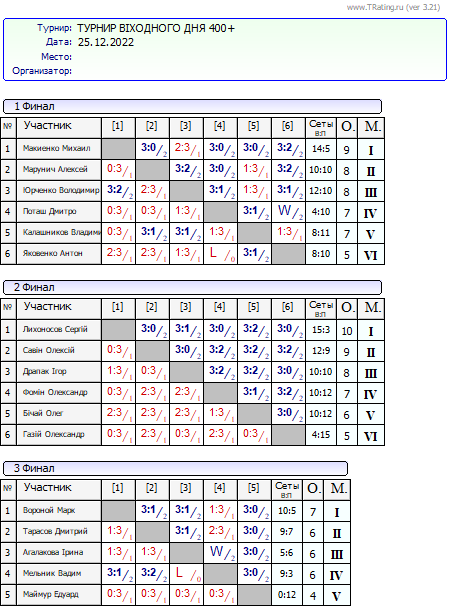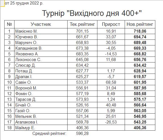 Результати турніру “Вихідного дня 400+” за 25.12.2022