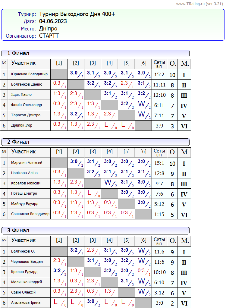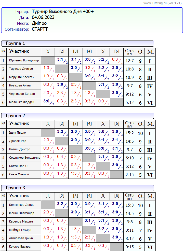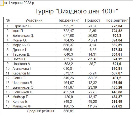Результати турніру “Вихідного дня 400+” за 04.06.2023