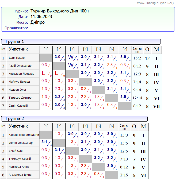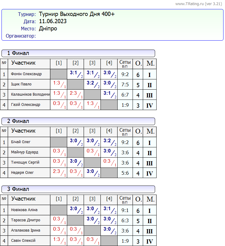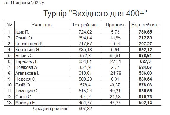 Результати турніру “Вихідного дня 400+” за 11.06.2023