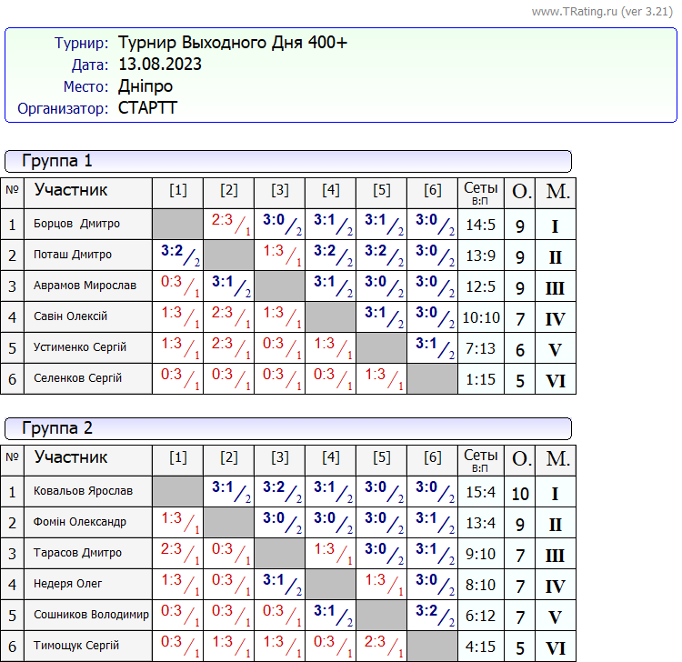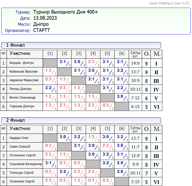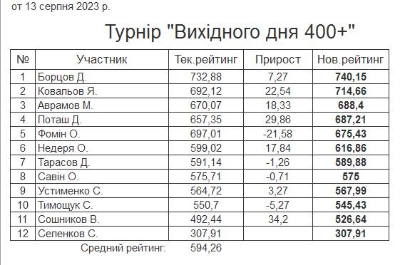 Результати турніру “Вихідного дня 400+” за 13.08.2023