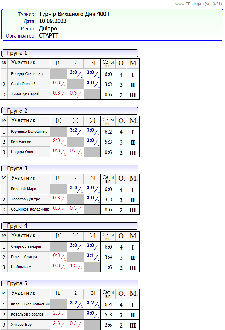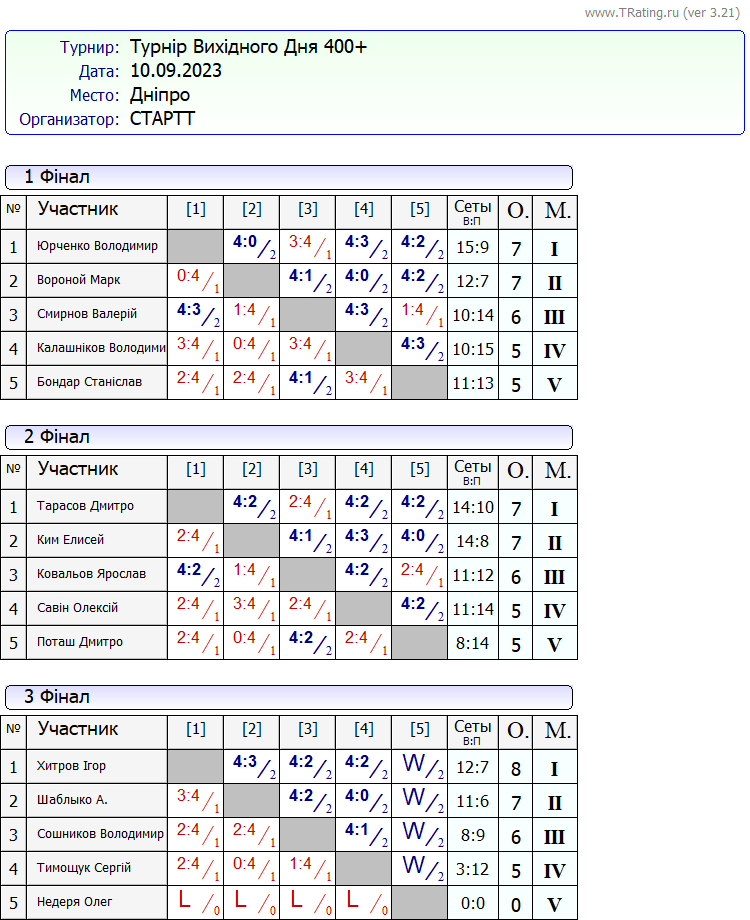 Результати турніру “Вихідного дня 400+” за 10.09.2023