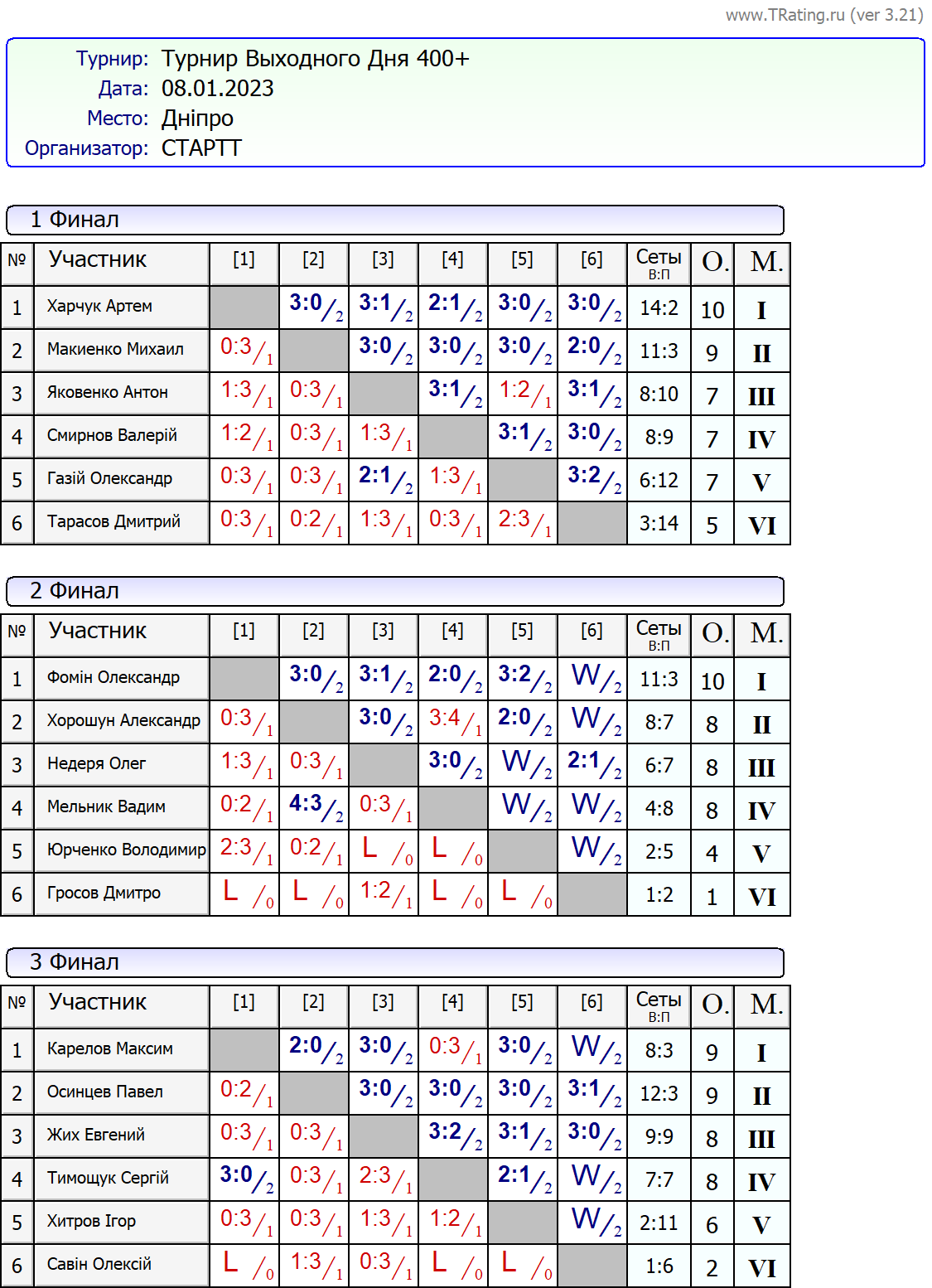 Результати турніру “Вихідного дня 400+” за 08.01.2023