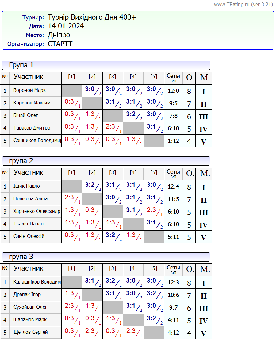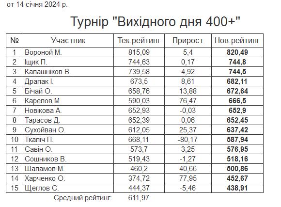 Результати турніру “Вихідного дня 400+” за 14.01.2024