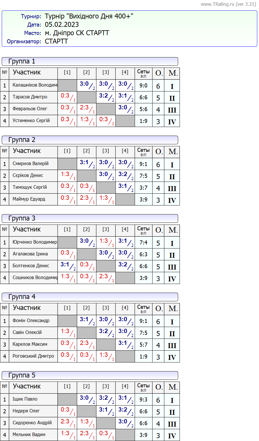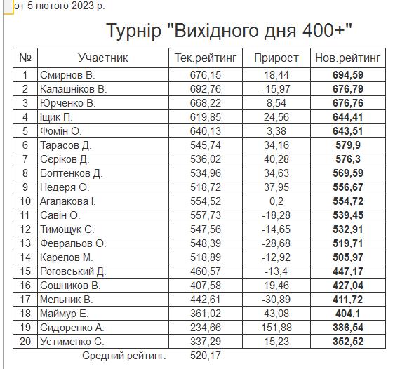 Результати турніру “Вихідного дня 400+” за 05.02.2023
