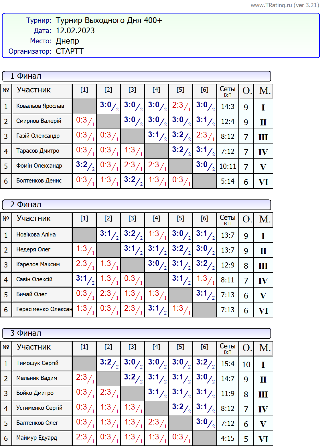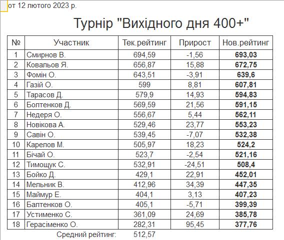 Результати турніру “Вихідного дня 400+” за 12.02.2023