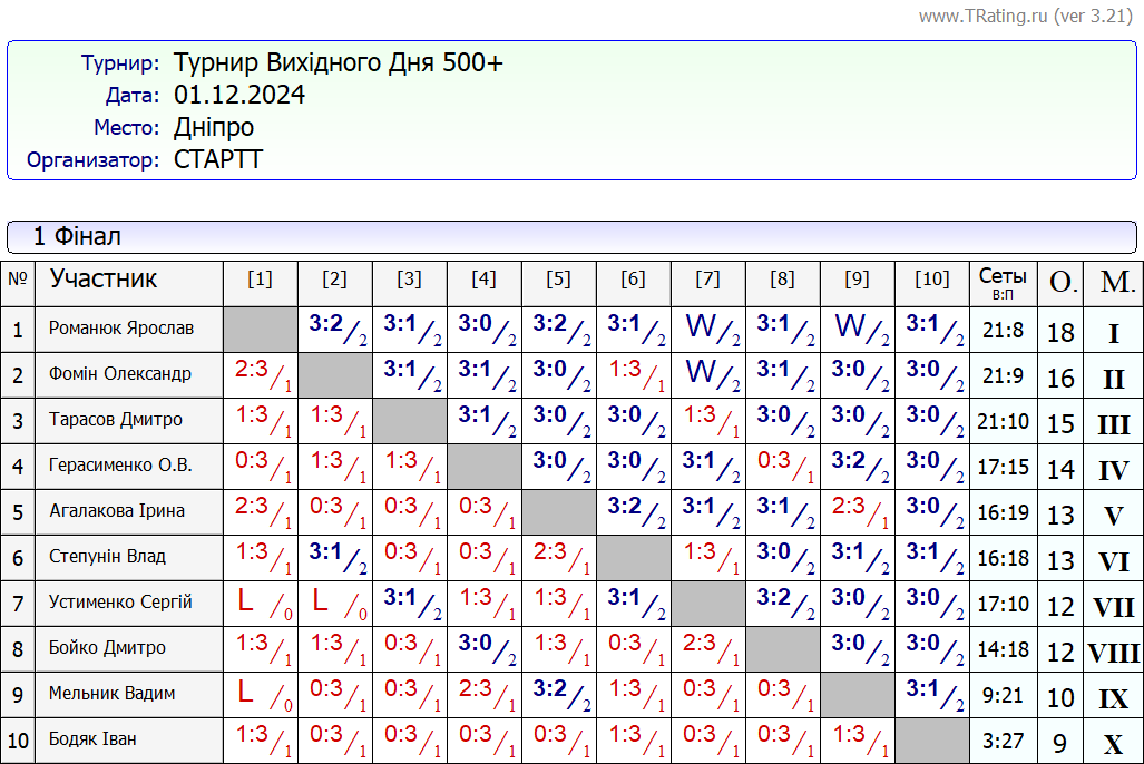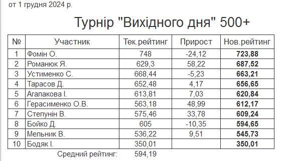 Результати турніру “Вихідного дня 500+” за 1.12.2024