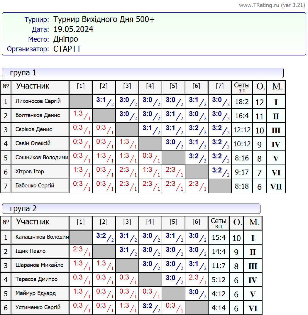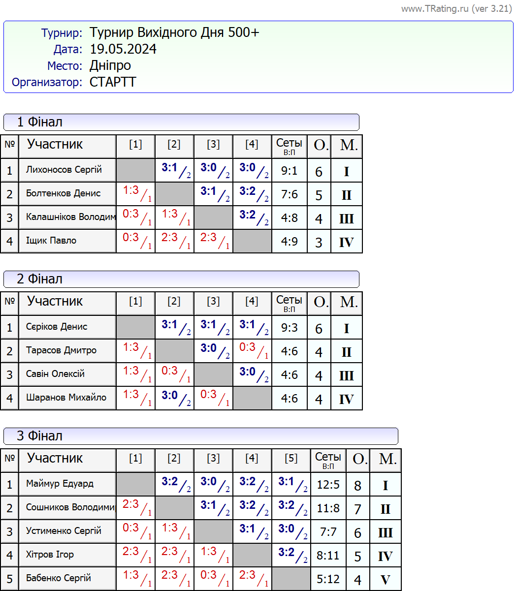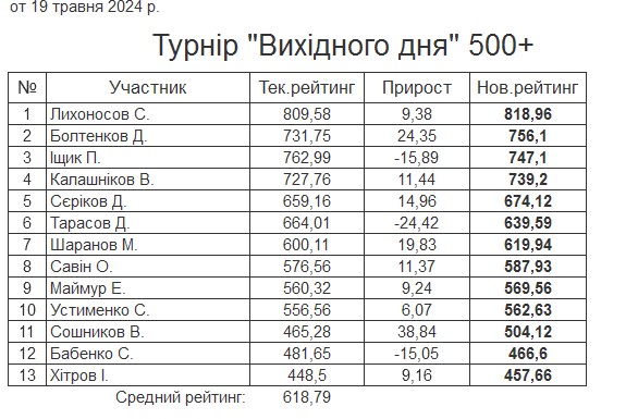 Результати турніру “Вихідного дня 500+ (Рейтинговий турнір)” за 19.05.2024