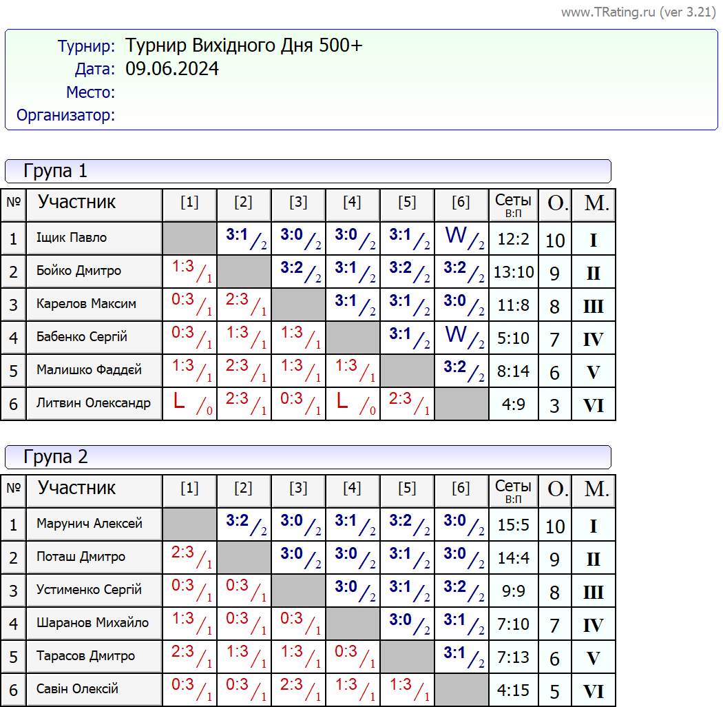 Результати турніру “Вихідного дня 500+ (Рейтинговий турнір)” за 9.06.2024