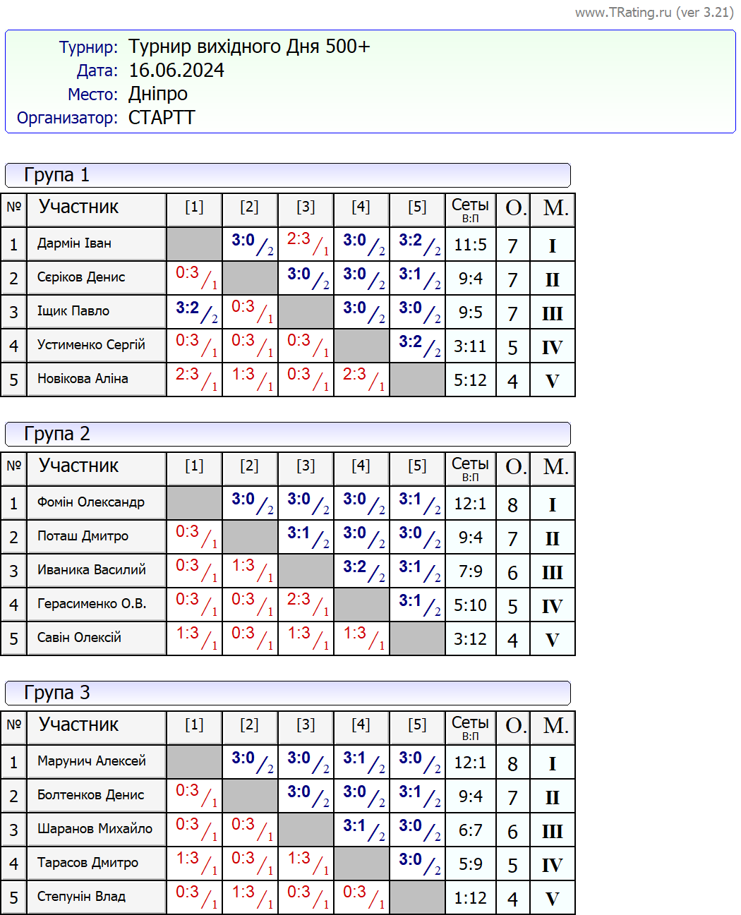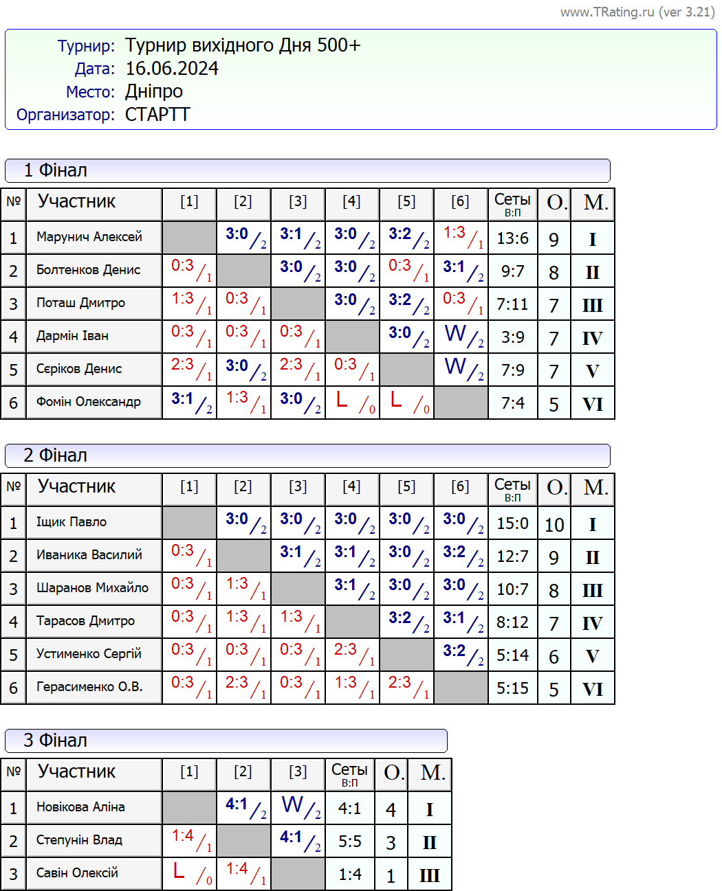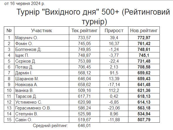 Результати турніру “Вихідного дня 500+ (Рейтинговий турнір)” за 16.06.2024