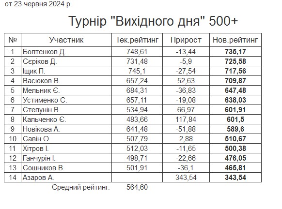 Результати турніру “Вихідного дня 500+ (Рейтинговий турнір)” за 23.06.2024
