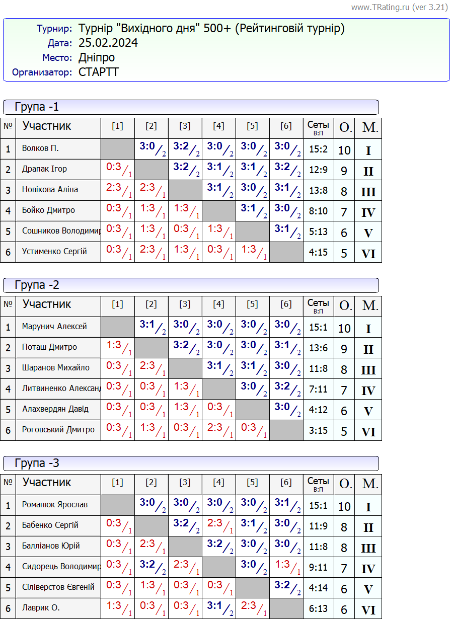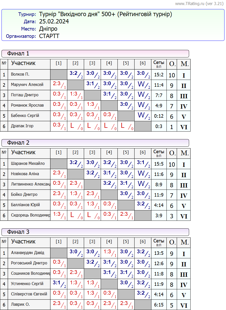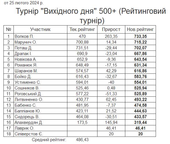 Результати турніру “Вихідного дня 500+ (Рейтинговий турнір)” за 25.02.2024